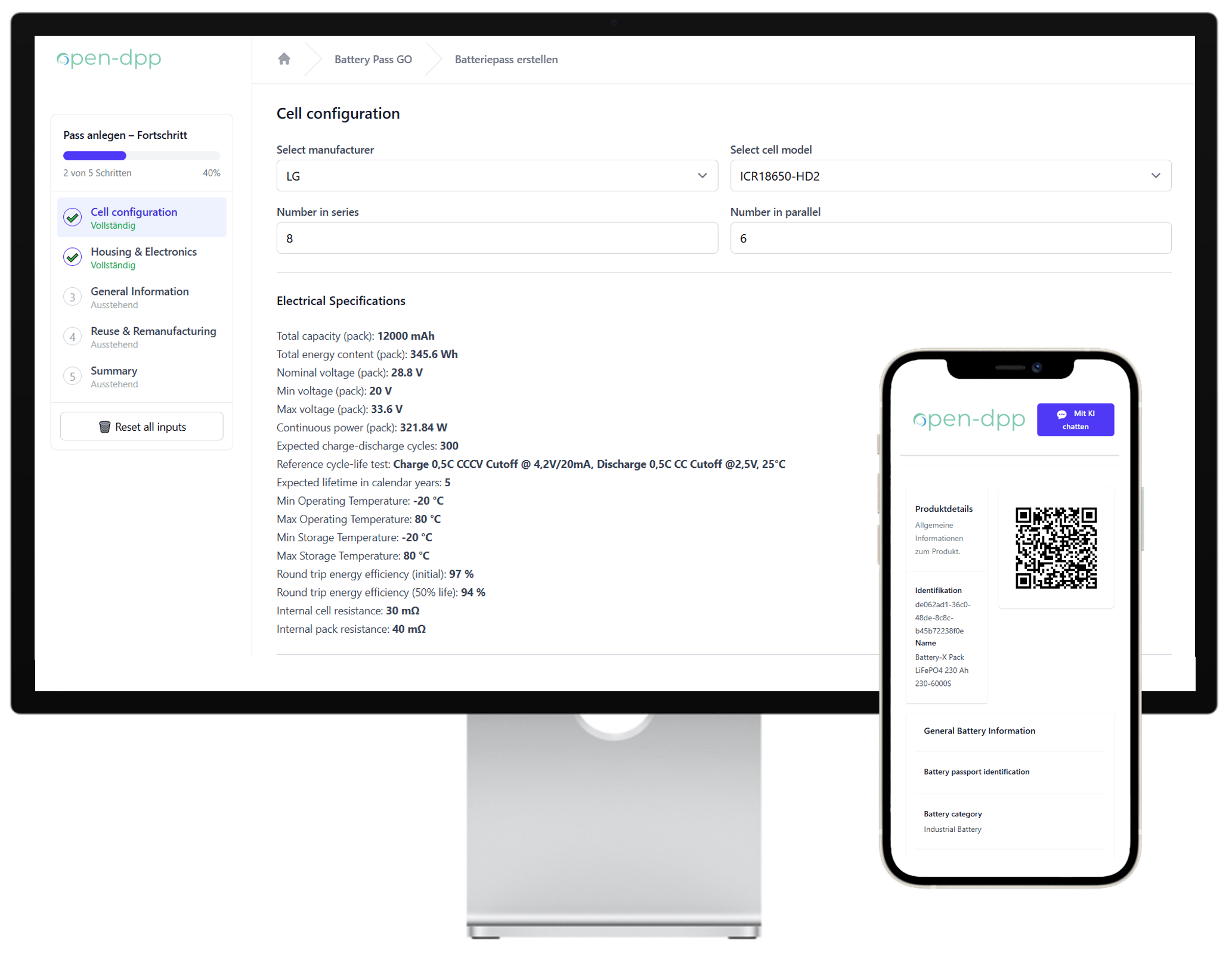 Mit unserem Battery Pass Generator erstellen Sie ohne Vorkenntnisse einen rechtskonformen digitalen Batteriepass. Wählen Sie einfach den Zelltyp aus, geben Sie die Eckdaten Ihres Packs an, und alle notwendigen Informationen werden automatisch aus unserer Datenbank ergänzt.